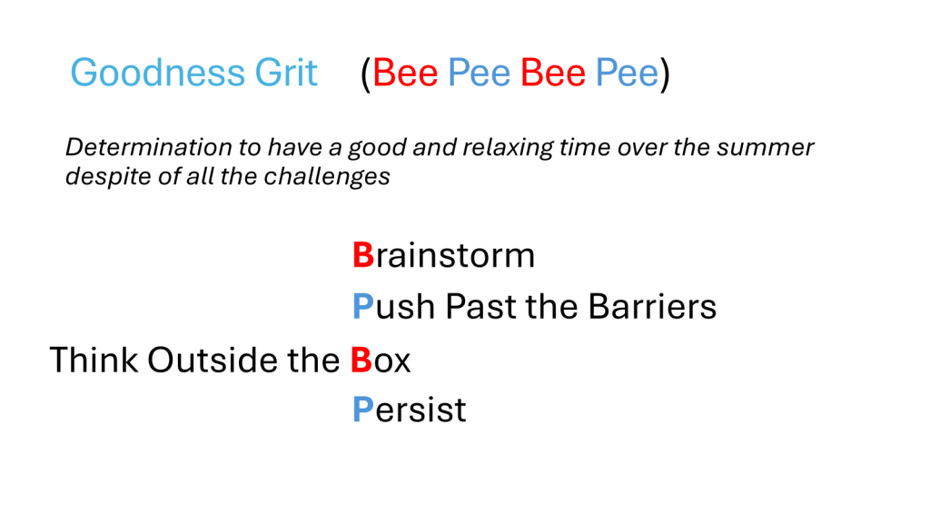 We can remember the anacronym Bee Pee Bee Pee that Brainstorming ideas, Pushing past the barriers (barriers such as -it’s too hot to go for a walk, or it’s too expensive go to that event), thinking outside the Box for solutions to the obstacles, and then Persisting (or being absolutely determined to find something positive and fun do in place of usual activities that maybe limited or have had to stop altogether).