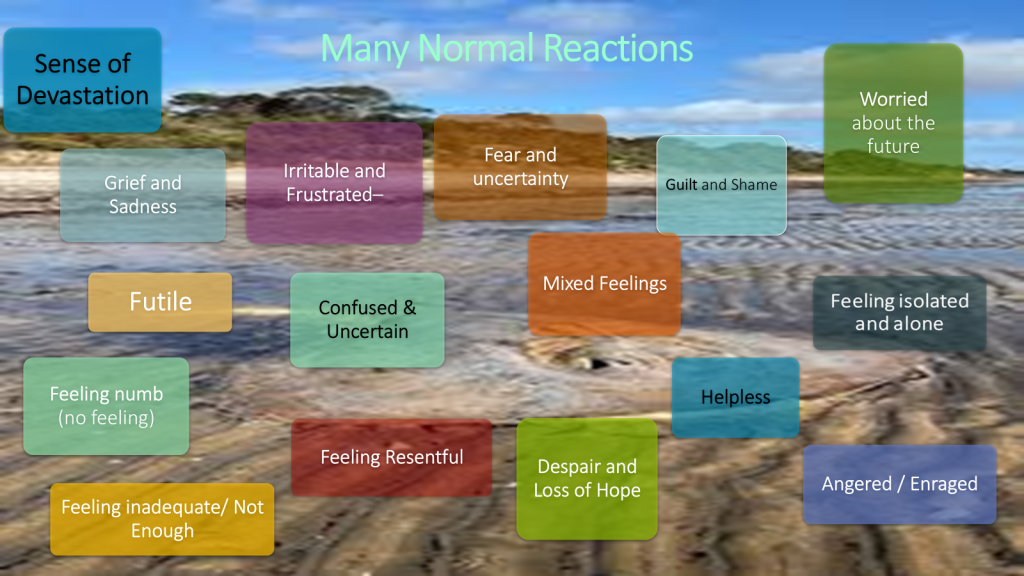 Emotions can change over time. For example, there are people in the community who reported feeling strong waves of sadness, shock and frustration early on, but now these feelings have changed to “low grade” irritability and a kind of “background” sadness and/or loss of energy and interest.