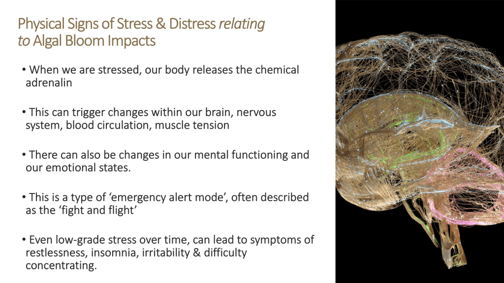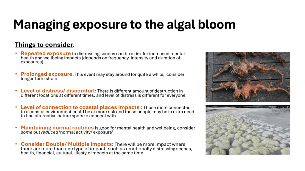 When thinking about the psychological toll of the bloom, there are a few things to consider when it comes to our exposure to the algal bloom’s destruction and coastal impacts. In particular, being repeatedly exposed to distressing scenes is a known risk factor for increased emotional distress and psychological symptoms.