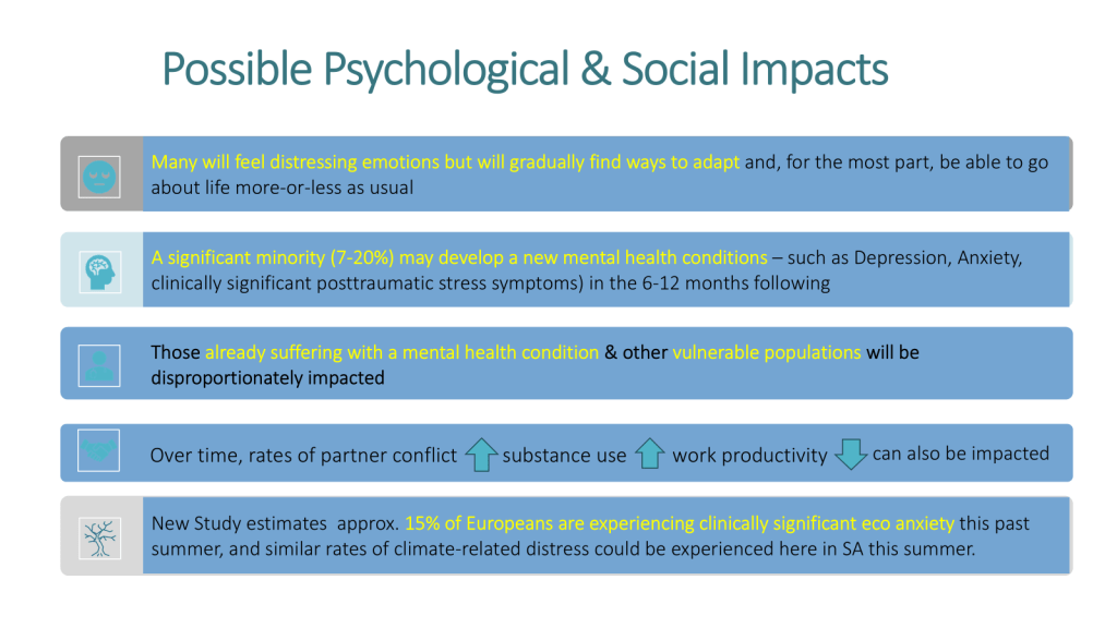 Research suggests, that at a community level, while many people will eventually find ways to adapt and cope, there could also be rises in the rates of people experiencing significant distress and other issues, such as increased conflict and substance use, as a result of the effects of the bloom.