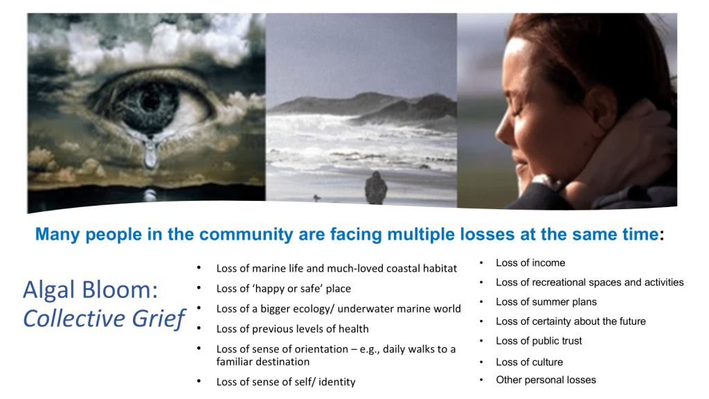 Another term that can be particularly useful when thinking about the current algal bloom crisis, is ‘loss without edges‘. That is, a sense that we are grieving for something that we don’t know the extent of. It is not possible currently to quantify all the marine life, or how long this crisis will go on for.
