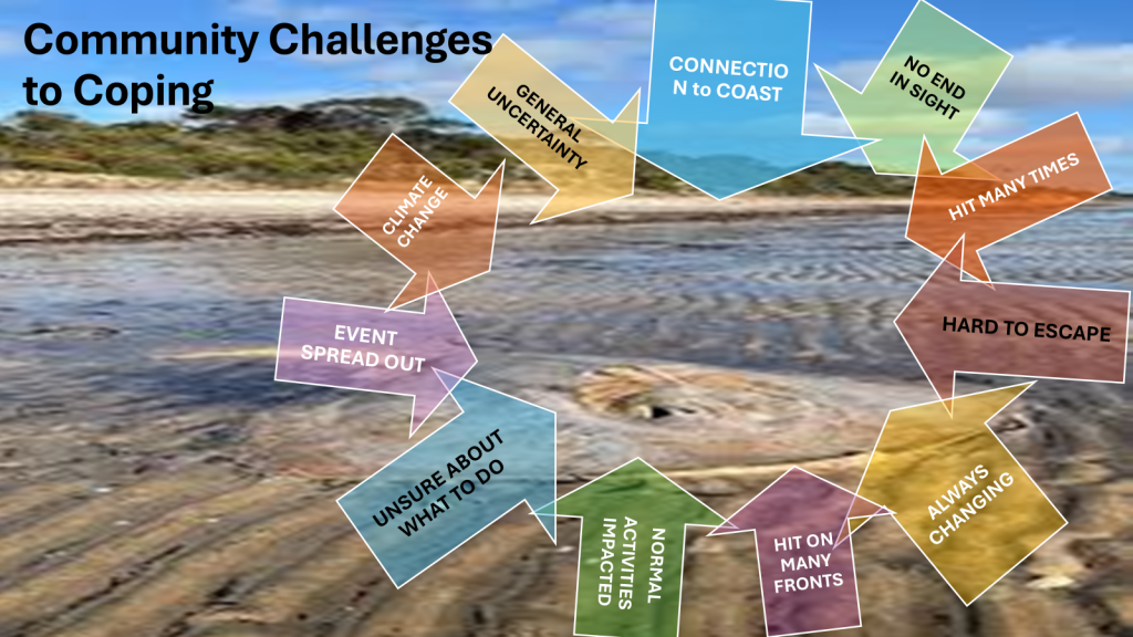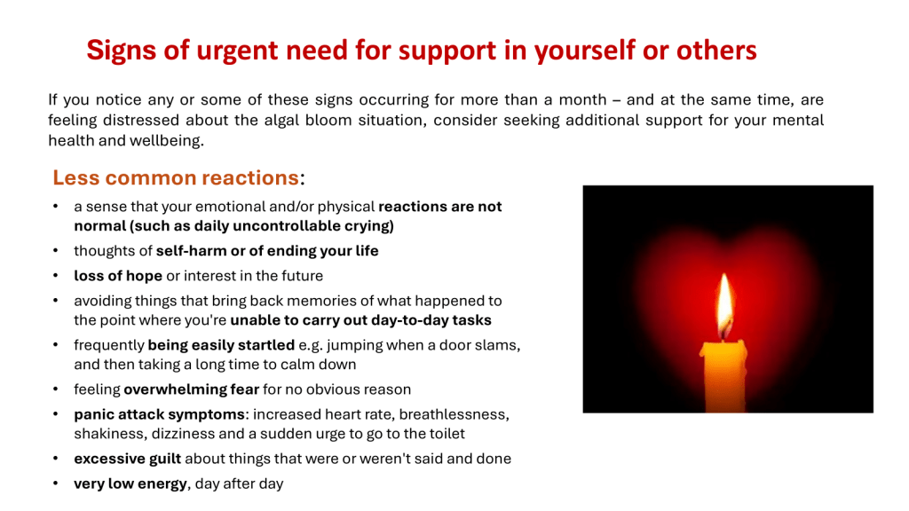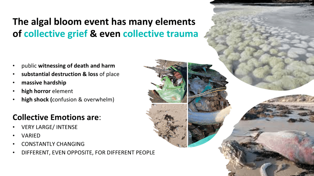 Many of us are repeatedly sharing the experience of all the distressing, even horrifying, scenes of dead and dying marine life and coastal habitat, as well as hold knowledge about hardship for many community members, including many people who we are close to.