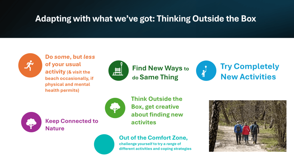 A final point. Many people are currently struggling with having lost their ‘happy or safe’ place. Some are feeling ‘out of sorts’ with their plans for summer having been disrupted. Some have even noted that they are struggling with their sense of identity, as it’s been strongly tied to their connection to the coast.